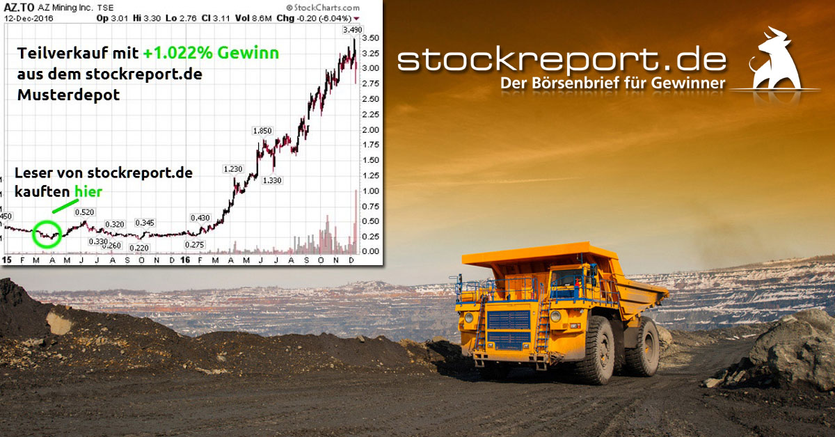 Arizona Mining Teilverkauf - Das Musterdepot von stockreport.de hat das Jahr 2016 mit einem Plus von 96,48% abgeschlossen...